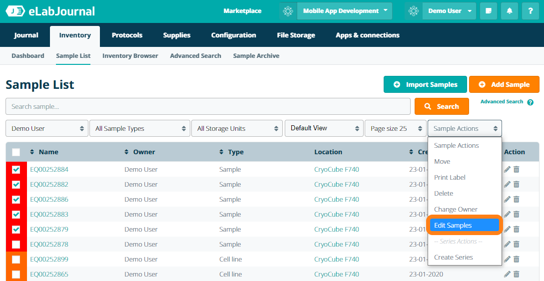 After installation of the Sample Batch Update add-on, you can select multiple samples and choose Edit Samples from the Sample Action drop down.