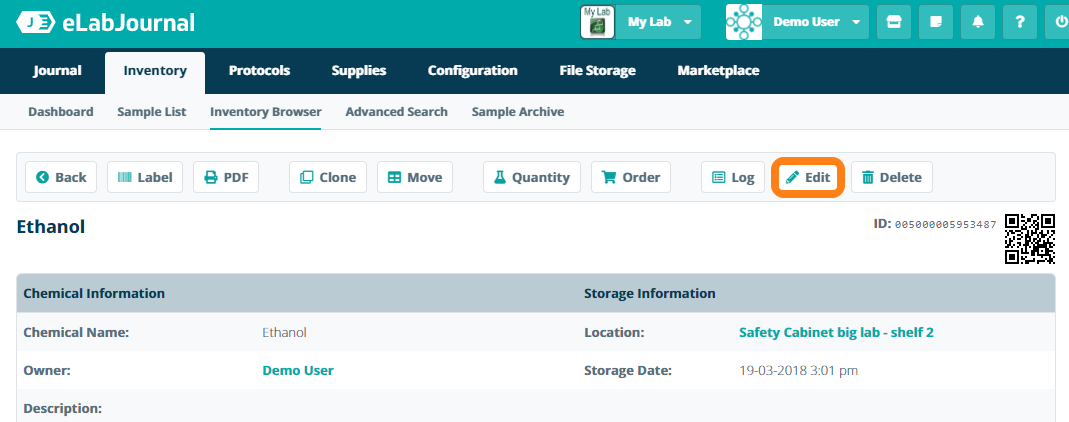 To set a quantity threshold for a sample, navigate to the sample's information page and click the Edit button.