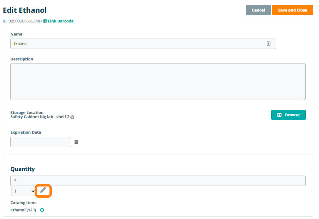 Within the sample's Edit page, click Edit icon in the Quantity section open the quantity settings.