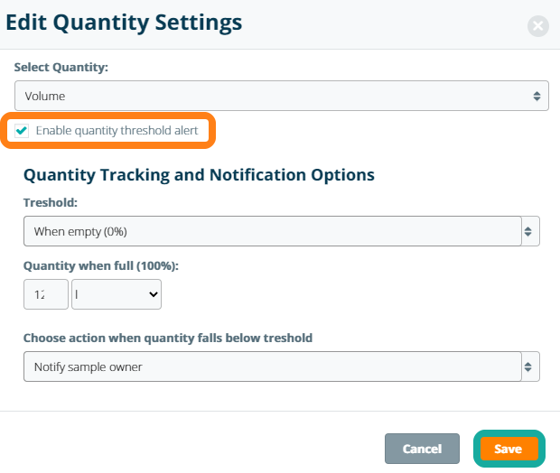 Quantity thresholds can be set for individual samples to inform users when their stocks are running low (Note: this feature is distinct from setting thresholds on a sample series).