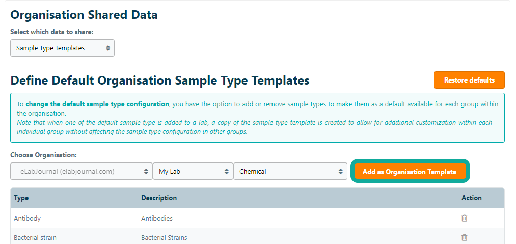 To share a sample type template select the group the sample type template is in, then select the sample type you want to share and click Add as Organisation Template. To remove a template click on the bin on the right side of the screen. You can also remove the system templates to completely customize the available default sample type templates available for each group.