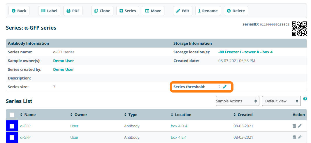 To keep track of the number of samples in a batch of samples or sample series, you can set a Series Threshold. Open the sample series information sheet and click the Edit icon to set the series threshold.