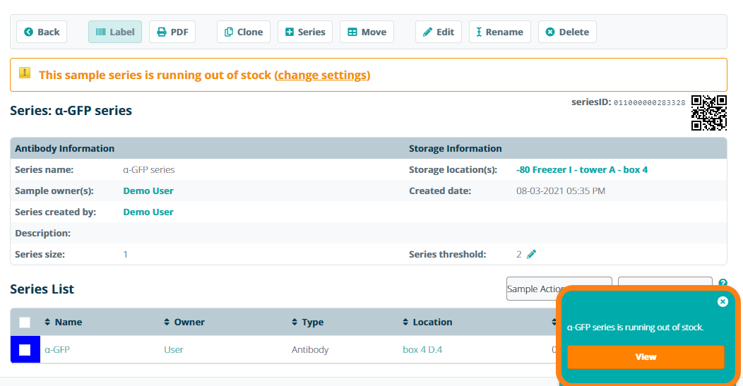 As samples within the the sample series are archived in the system, the number of samples in the series will decrease until it falls below the threshold. Once the threshold is passed, a message will be displayed on the sample information sheet to notify users that the stock is running low. The owner of the sample series will also receive a notification. If you have installed the eLabJournal Mobile App, an additional notification will be sent to your mobile device.