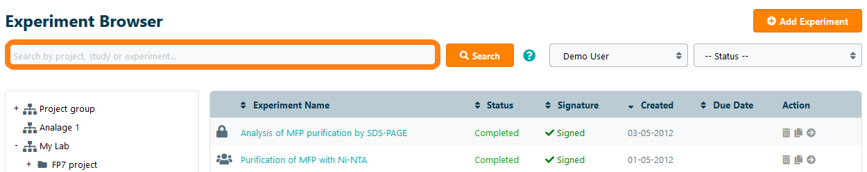 Note that experiments are searched for linked samples and files as well as their content (this is limited to the first 4000 cells of Excel files). For organizations using eLabHybrid,the files are not indexed and will not show up in the search results.