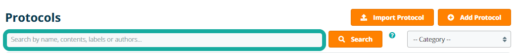 To search for a protocol in the public, group-shared, or personal protocol list, open the corresponding tab under the Protocols tab, enter a search term into the search bar, and click the Search button. When conducting a protocol search, the contents of the following fields are queried: