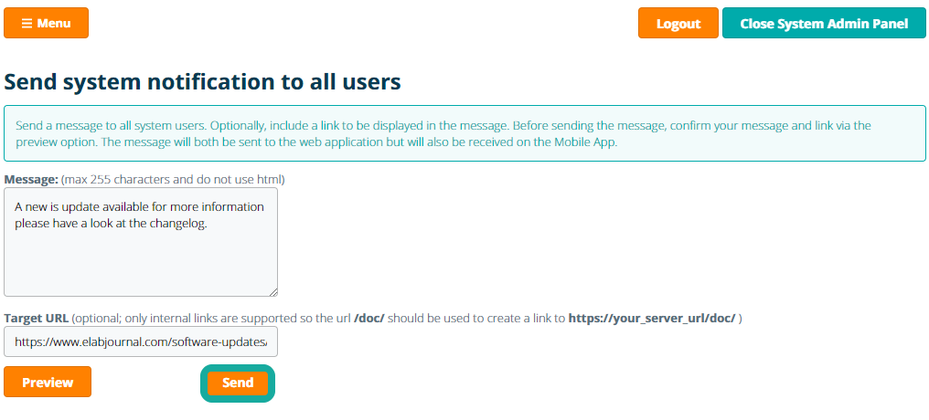 Enter the message and optionally include a link in the message. The message content should be plain text, maximal 255 characters and the notification is both sent to the webApp and the mobile app (if notifications are enabled on the mobile app). The optional link only supports internal links and therefore the link path should be relative (e.g. to refer to https://www.elabjournal.com/doc/ , the target URL should be /doc/). Note that included links are only included in the message sent in the webApp and not to the Mobile App.