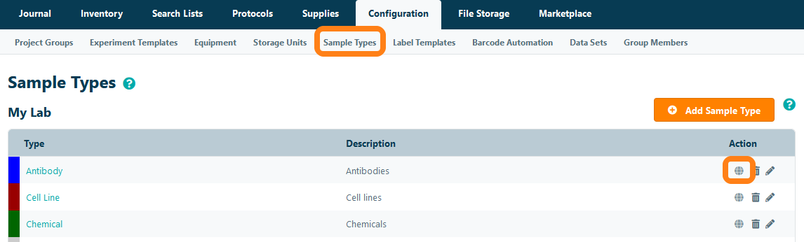 To share samples of a specific sample type with other groups in the company or institute, you can share sample types. Navigate to Configuration – Sample Types and click the Share icon for the chosen sample type.