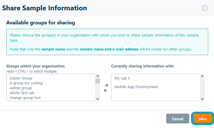 Select one or more groups in your company or institute and move them to the appropriate column using the arrow icons. Click the Add button to confirm and share samples of this sample type with the chosen labs. The group with whom the sample type has been shared can now find samples in the Organization Search option on the Advanced Search page. Note: when sharing a sample type with another group, the storage location of the samples will not be disclosed to the lab with whom they have been shared.
