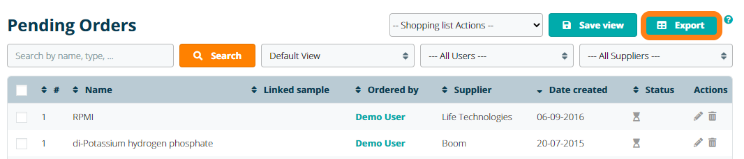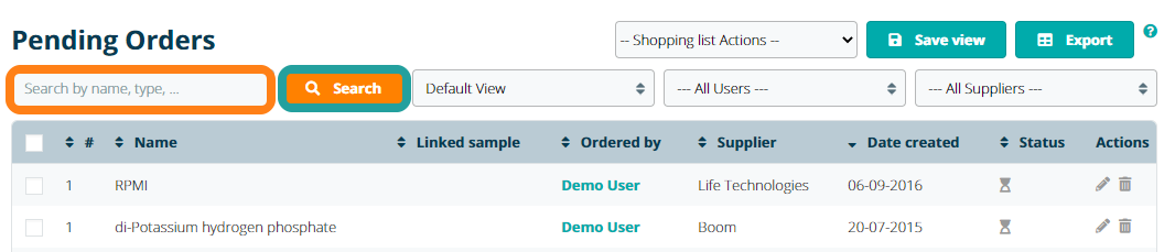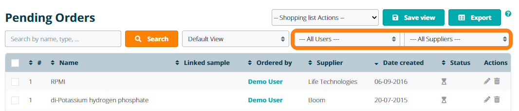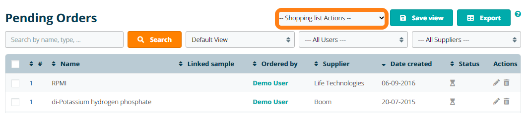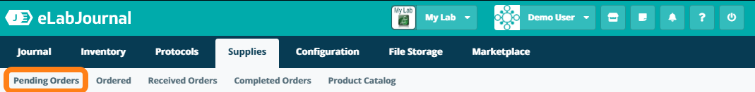 When an order has been created for an item in the Product Catalog, the order is added to the lab's shopping list where users can track its progress through the procurement cycle. Orders are sorted according to their status into the following pages: