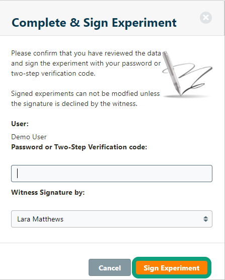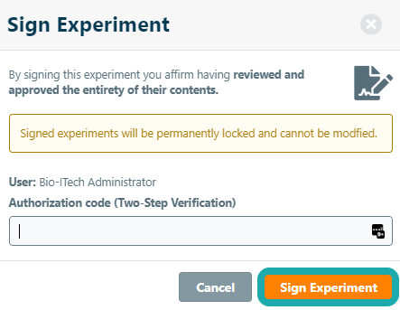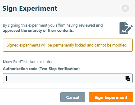 Enter your credentials and click Sign Experiment. Note that you can also sign your experiments with your two-step verification code.