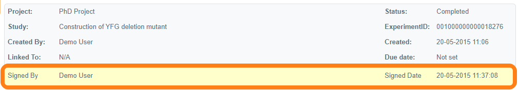 In compliance with Good Laboratory Practise (GLP) and according to CFR 21 part 11, experiments should be signed and locked after completion.
