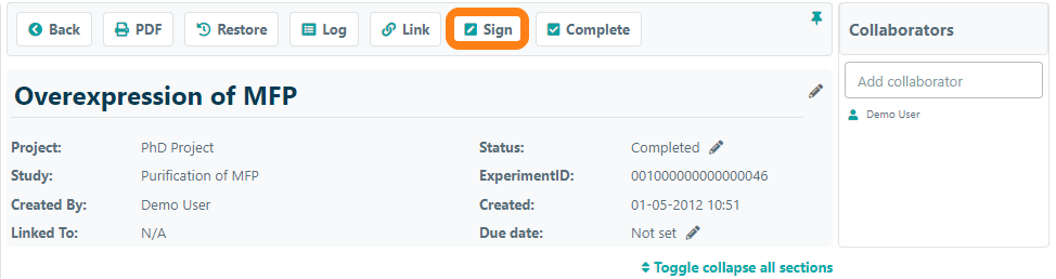 To sign an experiment, open the experiment and click the Sign button.