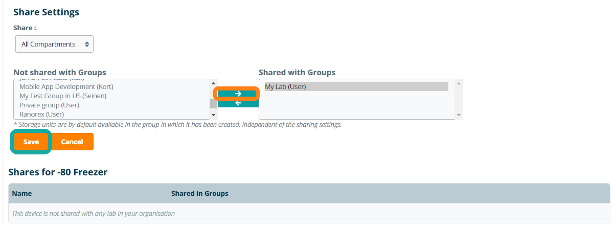 To share a device with a lab, first define the compartments you want to shared. By default, this is set to all compartments so that the entire storage unit will be shared. Next, choose one of the labs within your organisation and click on ->. In this way, you can share a device with multiple labs in the organisation. Click Save to share the selected compartments with the selected lab(s).