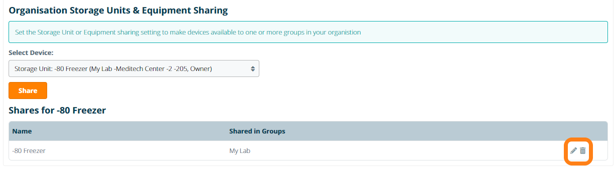 After selecting the device (i.e. storage device or equipment) set-up within your organisation, you can see the current device sharing setting or set sharing of the device by clicking Share.
