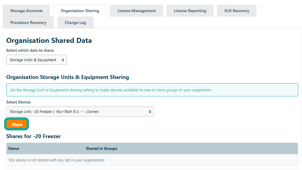 In the Organisation Admin panel, you can manage the sharing of storage devices and equipment to make them available for other labs in your organisation. In this way, different labs can have access to (parts of) a storage device to store samples or to the equipment planner, to book devices or see when a device is available.