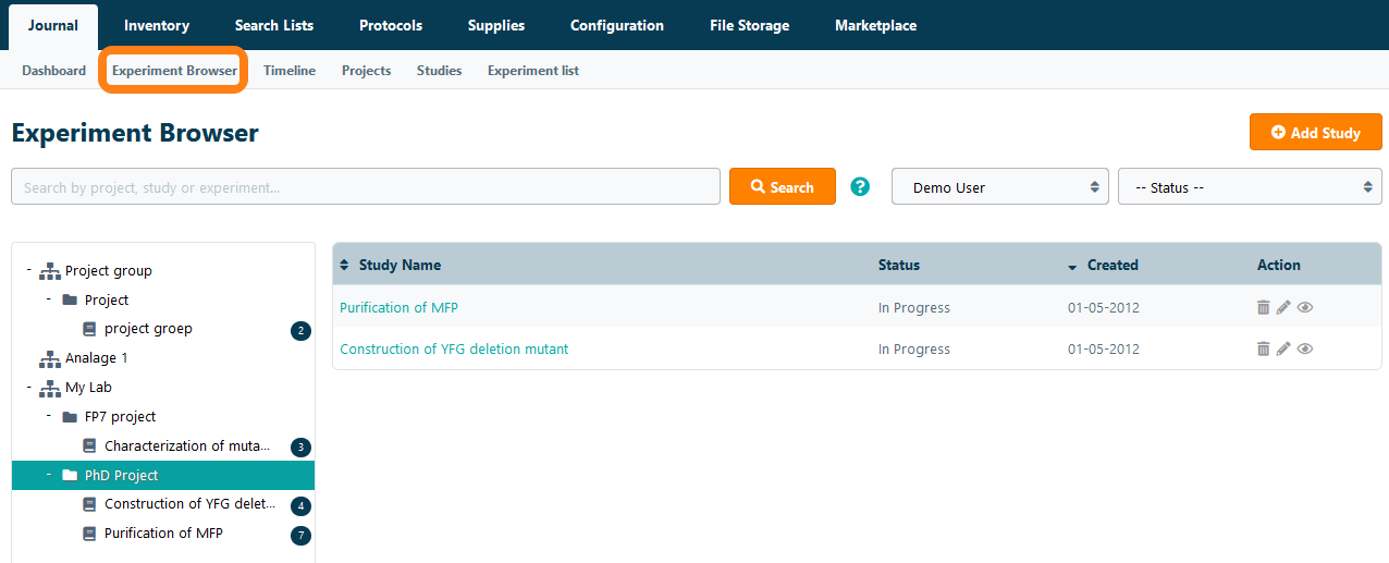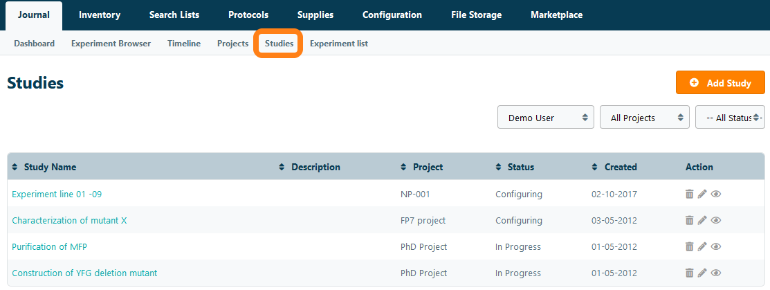 Within a project, users can create studies, which can each contain multiple experiments. Navigate to the Studies page under the Journal tab to view a list of all the studies in a lab.