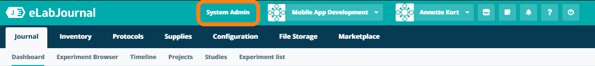 For eLabJournal Private Cloud or On-Premises installations, a full system administrator access can be provided to a System Administrator. The System Administration has access to a dedicated panel with entreprise features to manage the system at the organisation level.