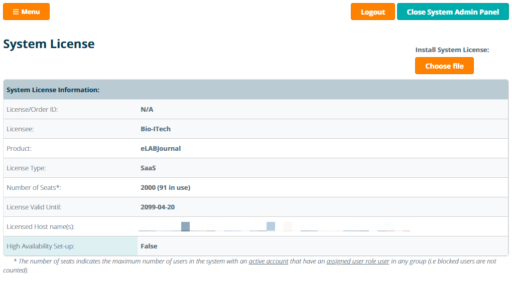 All eLabJournal On-Premises and Private Cloud System installations require a system license. The system license is provided by eLabNext upon installation of the system and ensures access for the purchased number of users through the period for which a license was purchased. In case of a license upgrade or extension, eLabNext will provide a new system license that can be installed by the system administrator / key user of the system. Note: for On-Premises installations with a Perpetual license, only the number of users is taken into account.