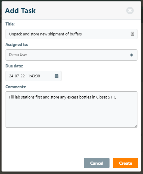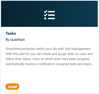 Streamline processes within your lab with Tasks. With this add-on, you can create and assign tasks to users as well as track their status. Users automatically receive a notification when a task is assigned to them. Assigned tasks are listed on the dashboard to raise awareness for any pending tasks. Note: the current iteration of Tasks does not support audit trails.