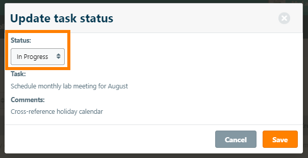 In the Update task status window, select the new status value from the dropdown list and click Save to apply.