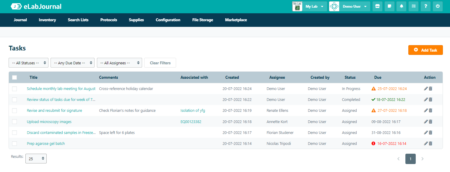 Additionally, users can also view and manage their task list from the Dashboard when they log into eLabJournal.