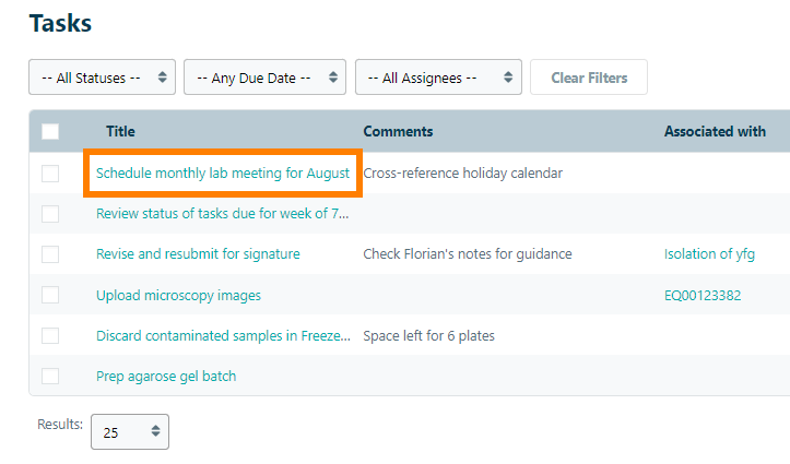 Users can also create tasks that are associated with a specific sample. To create a task for a sample, navigate to the sample's details page and click the Task button. Once the task has been created, a link to the sample will be listed in the Associated with column on the Tasks panel.
