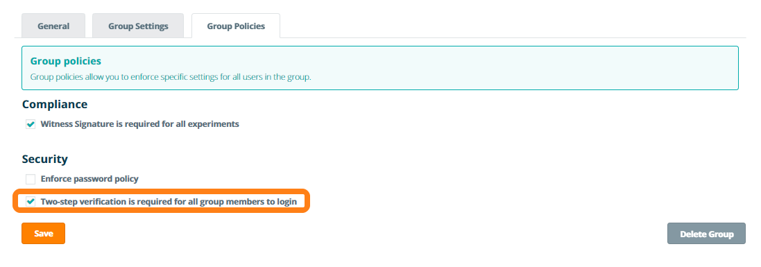 As a group administrator, you can enforce two-step verification for all members in the lab by changing the Group Policy. Navigate to My Groups and click Edit. In the Group Policy tab, you can enable the option to make two-step verification mandatory for all lab members.