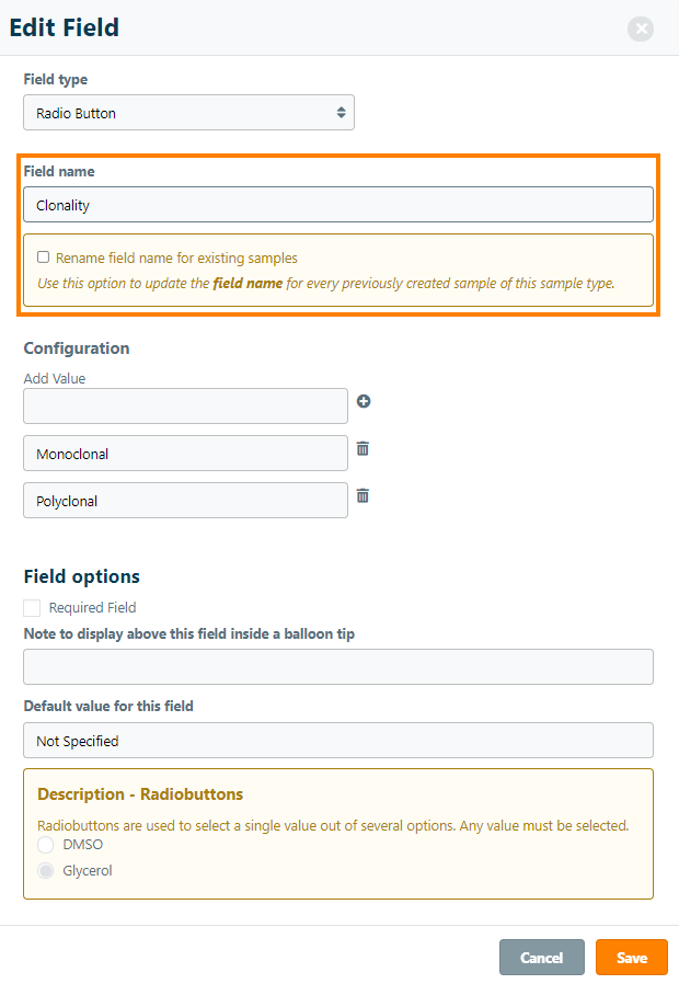 In the pop-up window, you can make changes to the field's properties. Note that when a Field name has been edited, the user will be given an option to rename the field name for all existing samples of that sample type.