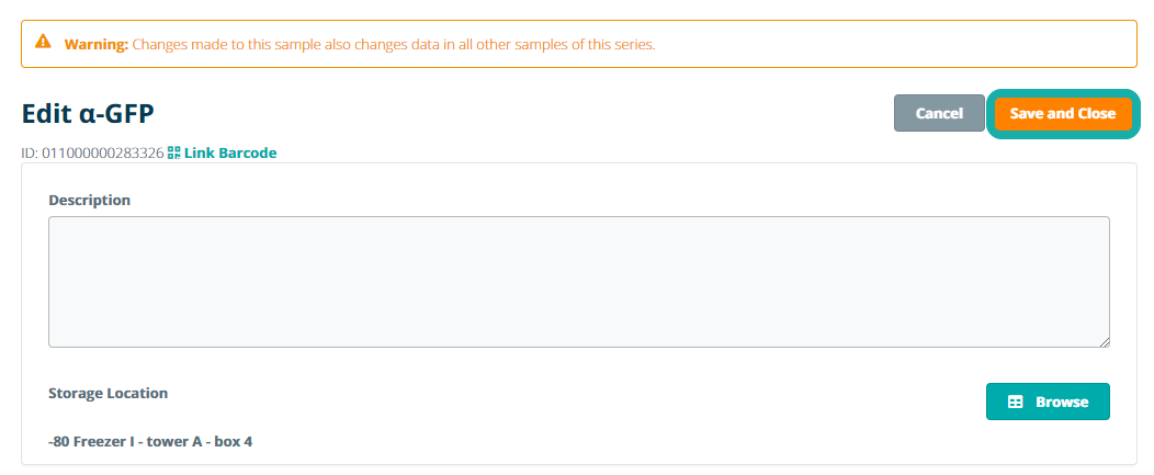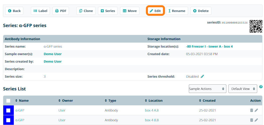 To update information on a sample series, you can edit the sample series. Open the sample series information sheet and click Edit.