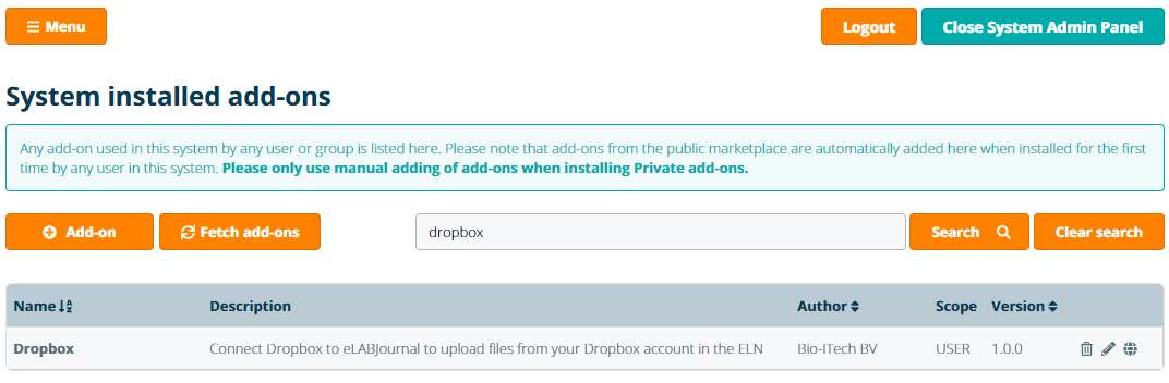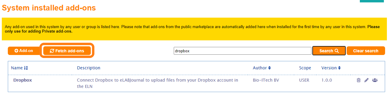 Any updated version of the existing add-on will automatically be recognized. Please note that for any add-on update, should apply a higher version number. The new add-on version will be listed in the Marketplace and offers users the option to update the add-on. In case you want to upgrade a public add-on you can click Fetch add-ons to retrieve the latest add-on updates from the set external add-on repository.
