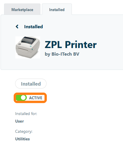 If you successfully printed a label, your printer has been correctly set-up and you can activate the ZPL Printer add-on for your eLabJournal account. Make sure that under installed add-ons in the Marketplace the ZPL add-on is installed and active.