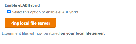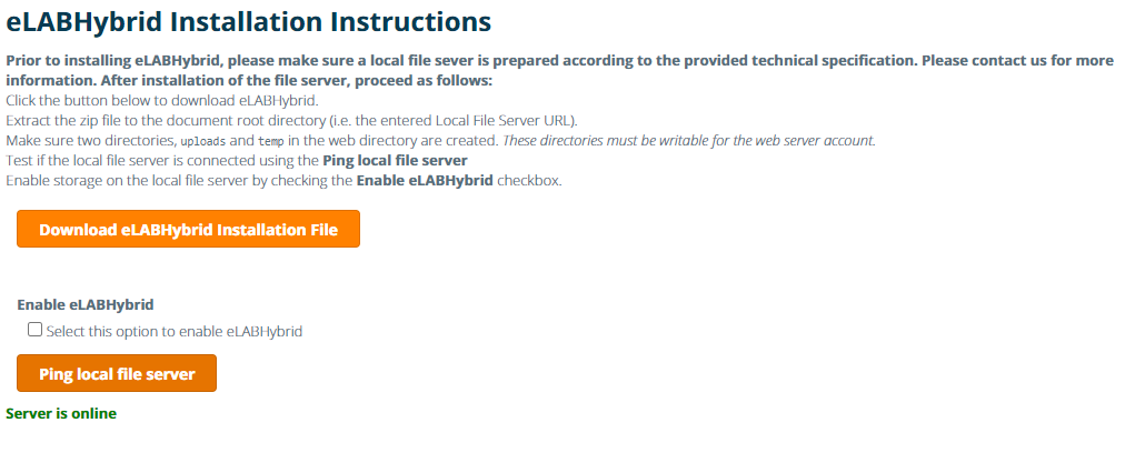 After installing eLABHybrid and confirming the sever connectivity, select the option Enable eLABHybrid. Activation of eLABHybrid will immediately result in the altering of the upload target for files in file sections within the ELN to the local file server.